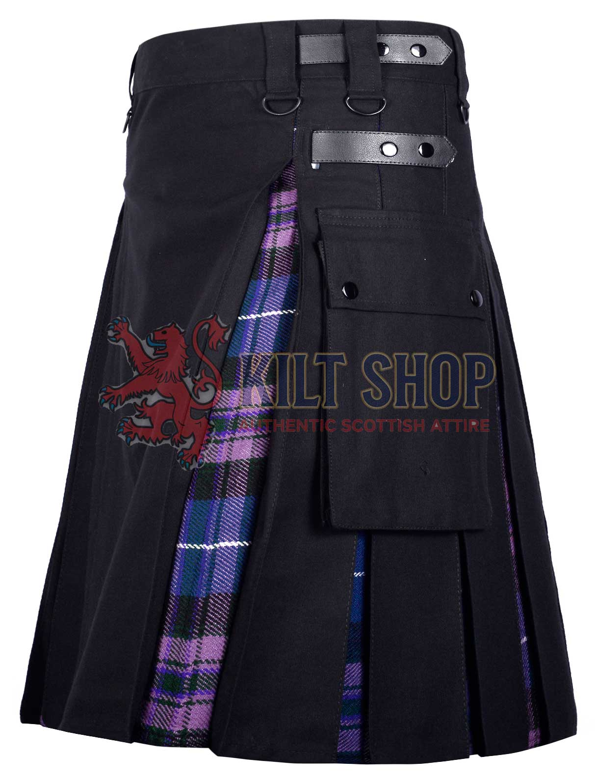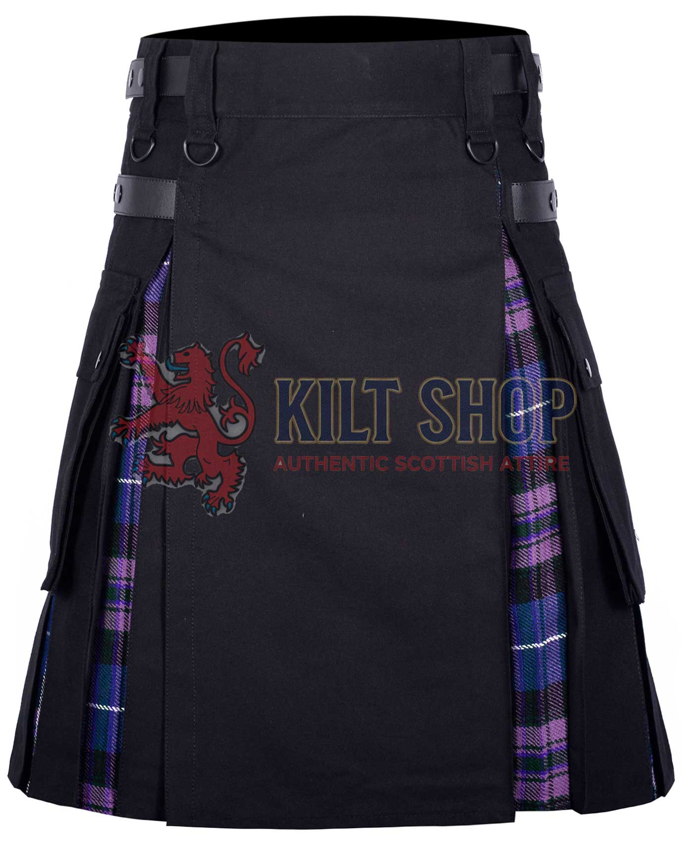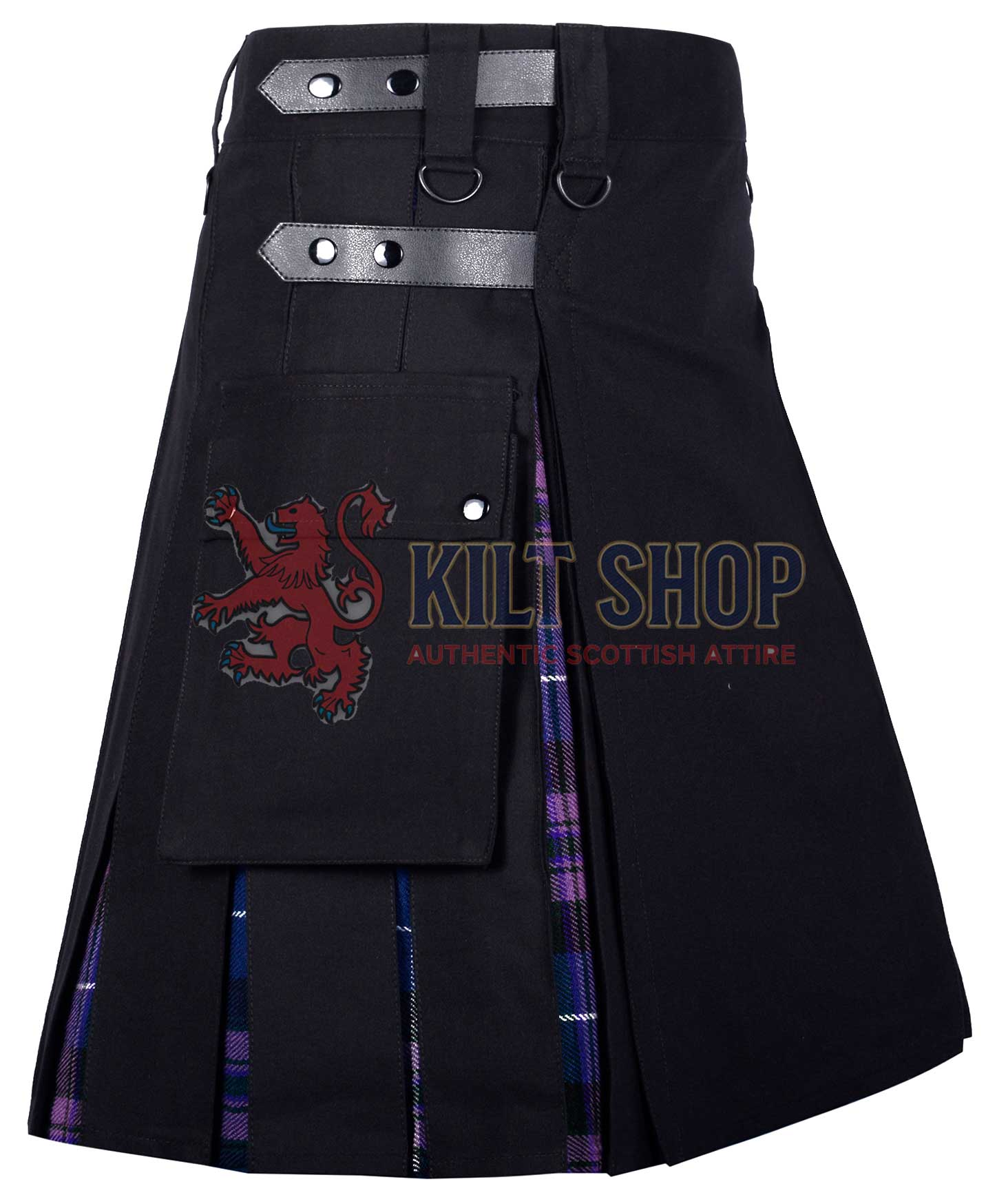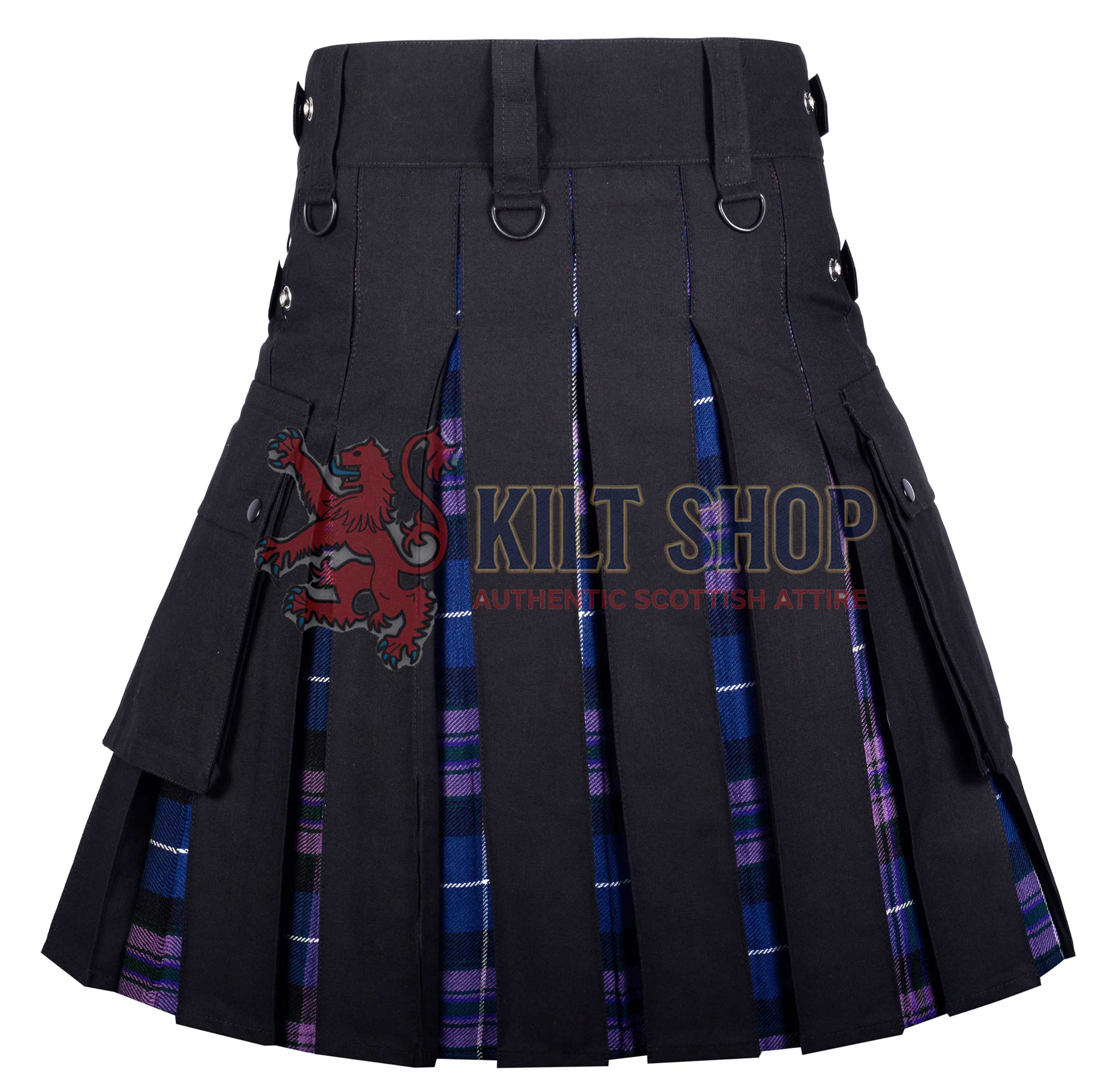Crafted from premium-quality cotton fabric, the black body provides excellent breathability, strength, and long-lasting wear. The Pride of Scotland tartan, known for its deep blues and rich pattern, adds a bold Highland character that honors Scotland’s proud history. The hybrid construction ensures freedom of movement while maintaining the authentic kilt silhouette, making it suitable for casual wear, festivals, Highland games, or modern street fashion.