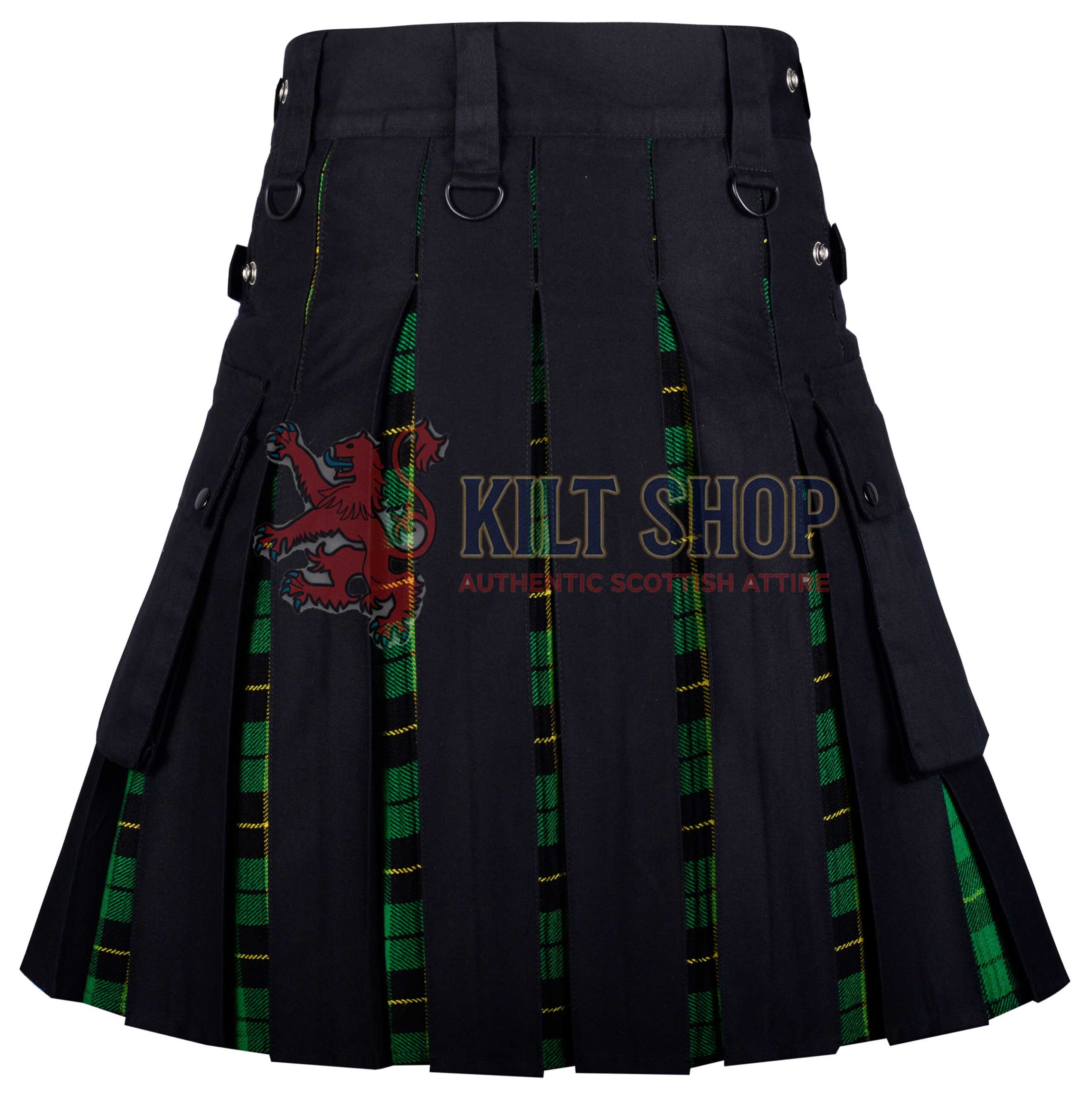 Crafted from premium-quality cotton fabric, the black body provides durability, breathability, and comfort for extended wear. The Wallace Hunting tartan, known for its deep green and earthy tones, delivers a subtle and dignified Scottish aesthetic, making this kilt ideal for outdoor events, Highland games, festivals, or everyday casual wear. The hybrid construction allows ease of movement while preserving the authentic kilt silhouette.