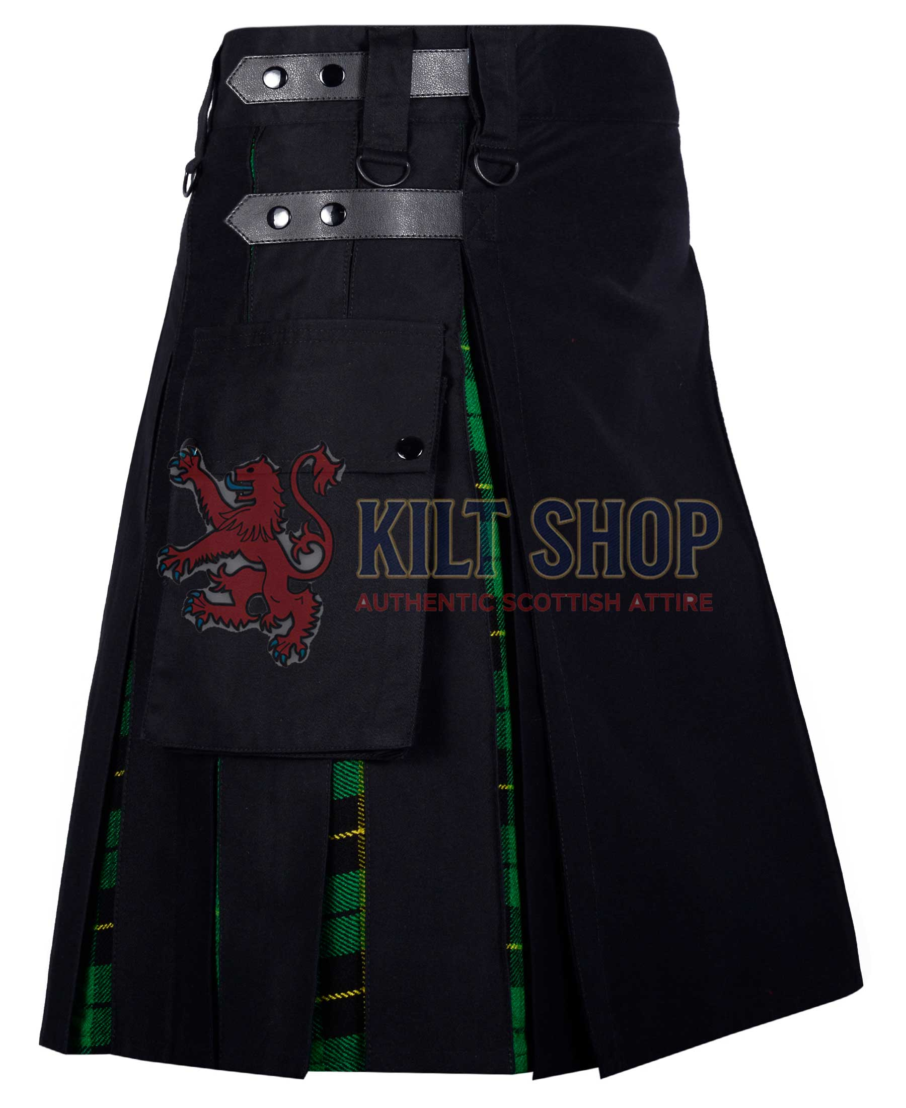The Black Cotton Wallace Hunting Tartan Hybrid Kilt is a refined blend of traditional Scottish heritage and modern utility design, created for men who prefer a rugged yet elegant Highland look. Featuring a solid black cotton base paired with the classic Wallace Hunting tartan panels, this hybrid kilt offers a timeless appearance with contemporary functionality.