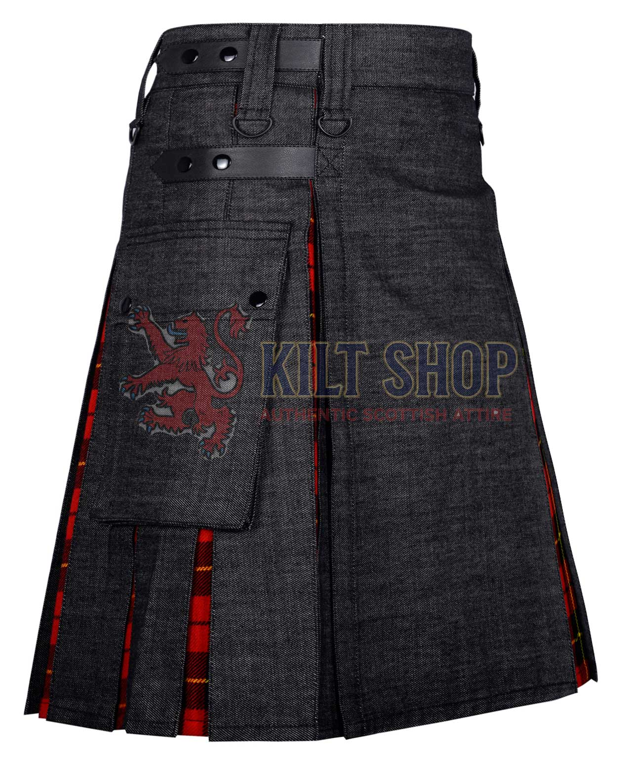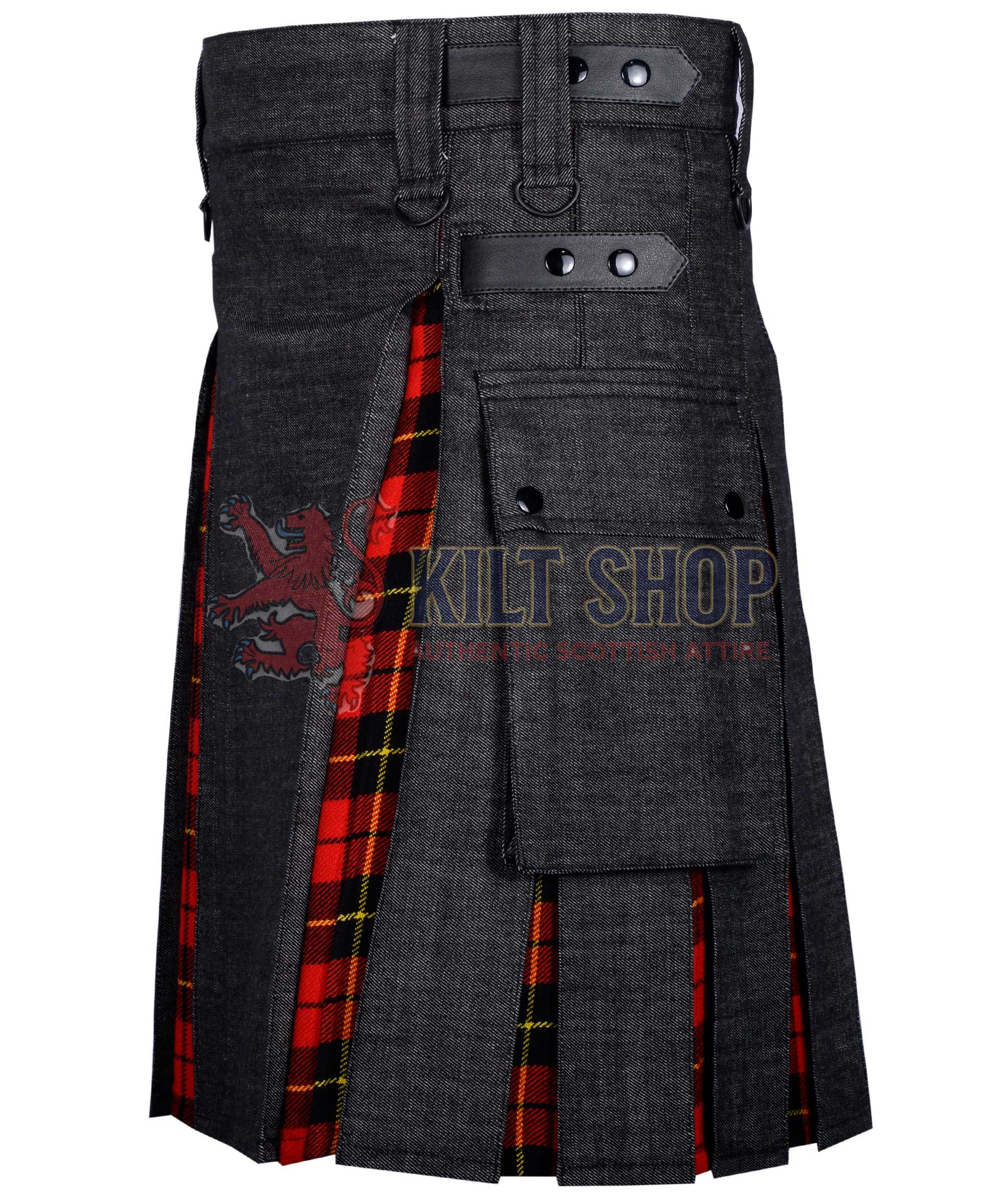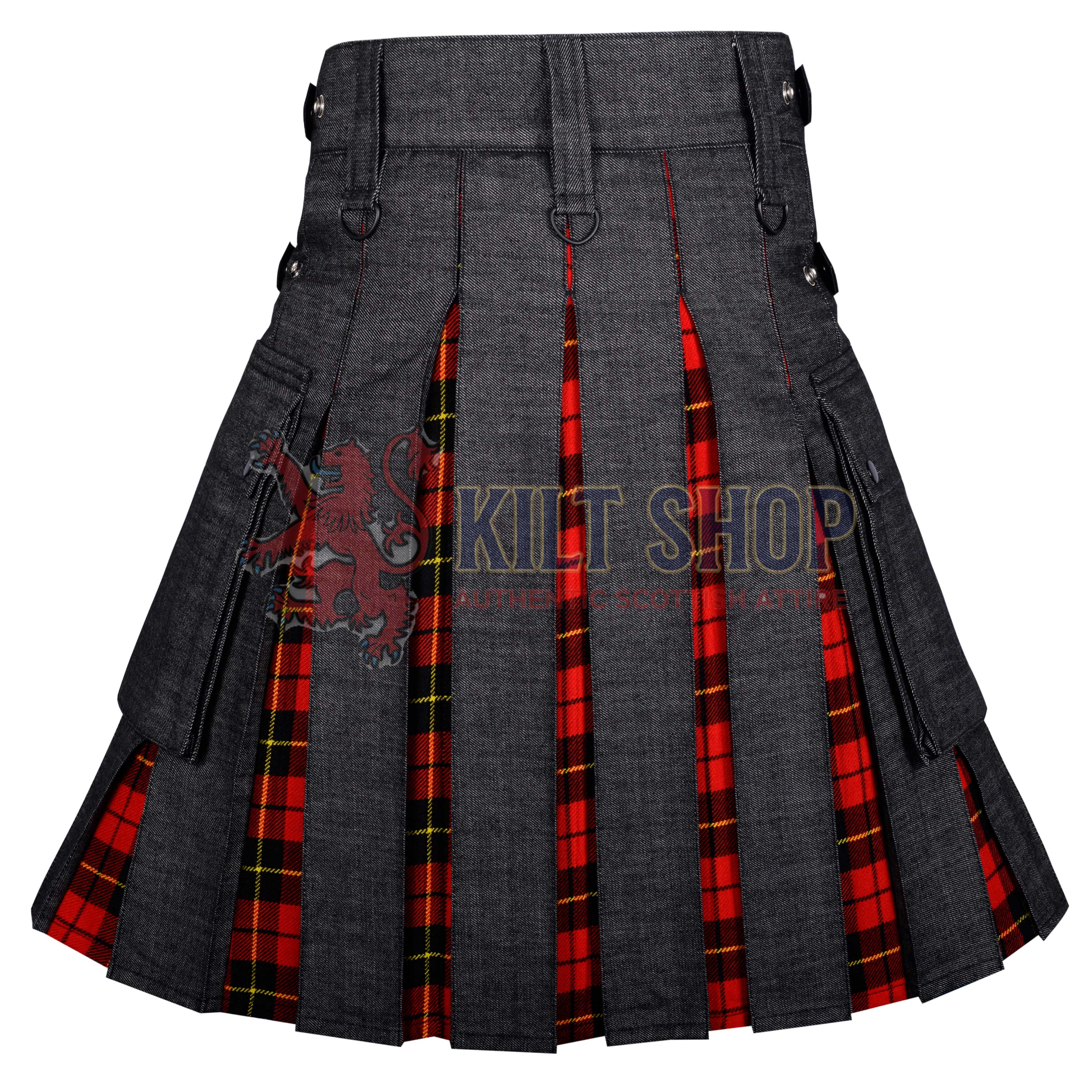 Crafted from premium-quality black denim, this kilt provides exceptional strength, structure, and long-lasting wear. Denim offers a heavier, more durable feel than traditional cotton, making it ideal for outdoor activities, workwear, festivals, and everyday casual use. The Wallace tartan, with its rich red and black pattern, adds a distinguished Scottish heritage touch, creating a bold contrast against the black denim base.
