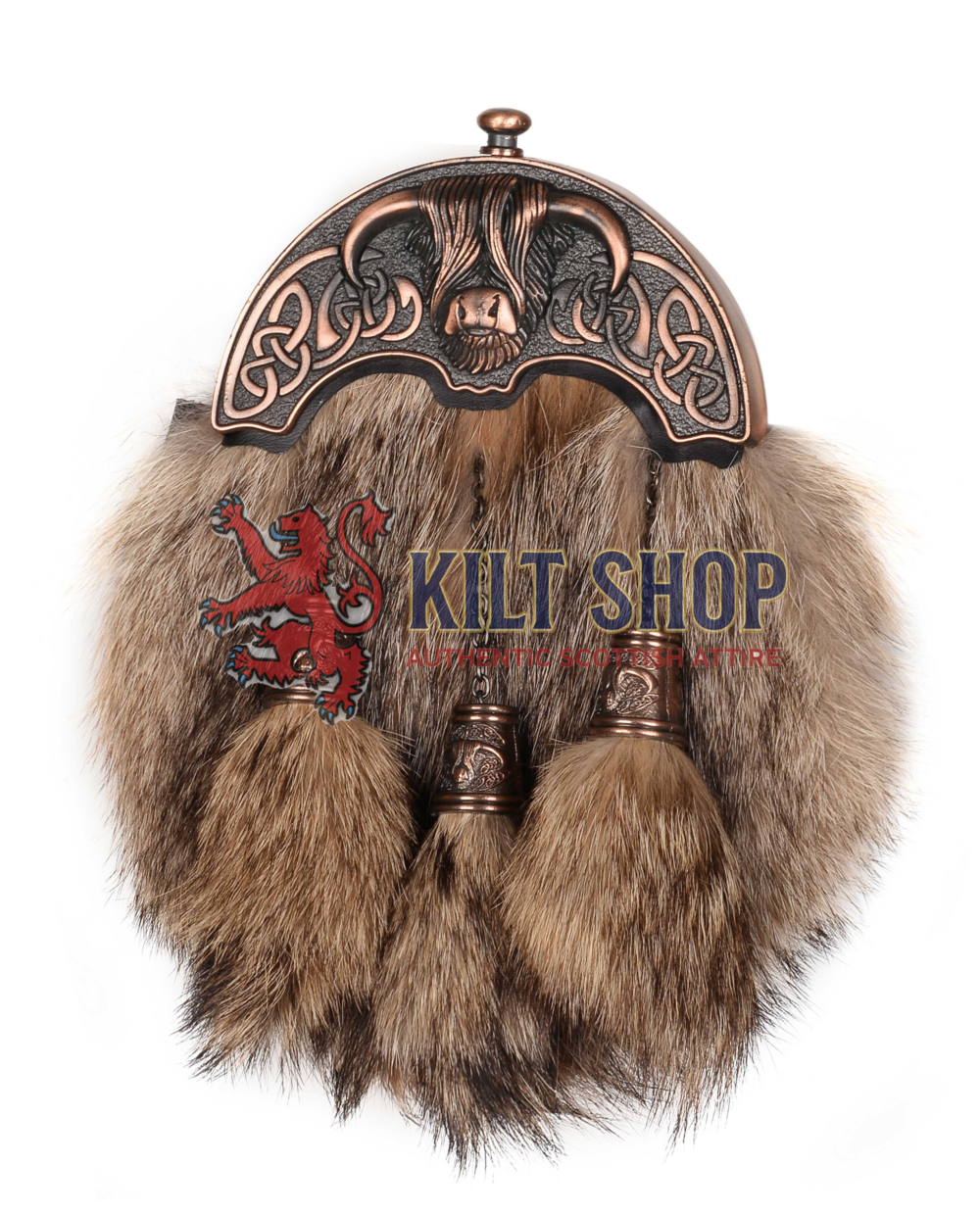 We pair this striking hardware with luxurious coyote fur, chosen for its thick texture, natural color blend, and exceptional durability. The fur’s mix of soft tans, greys, and browns gives the sporran a wild and authentic Highland look. Three matching coyote tassels with bronze caps complete the full-dress style, adding balance and ceremonial charm.
