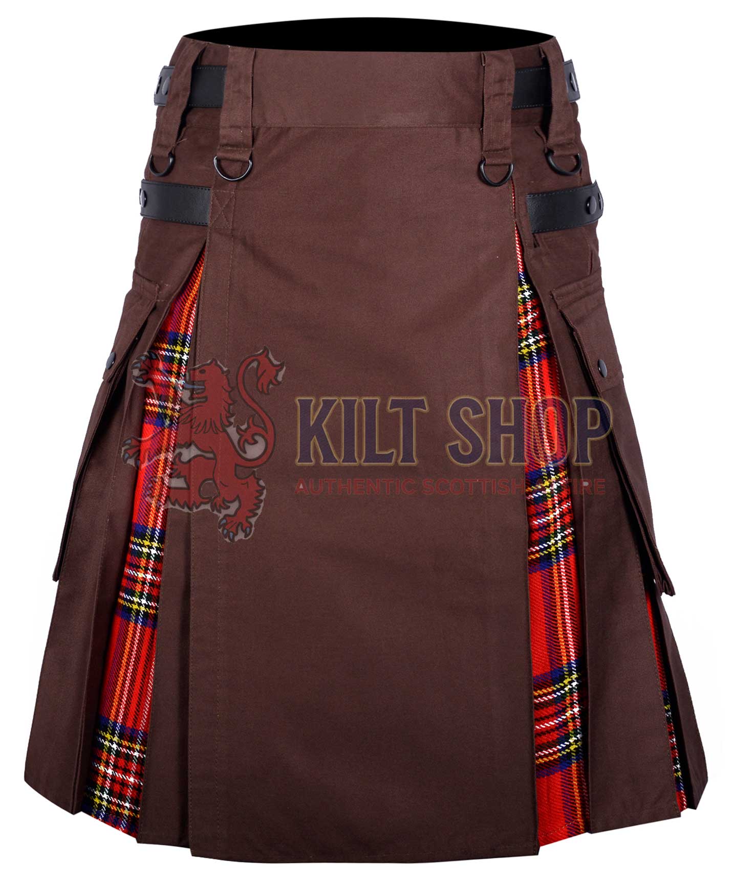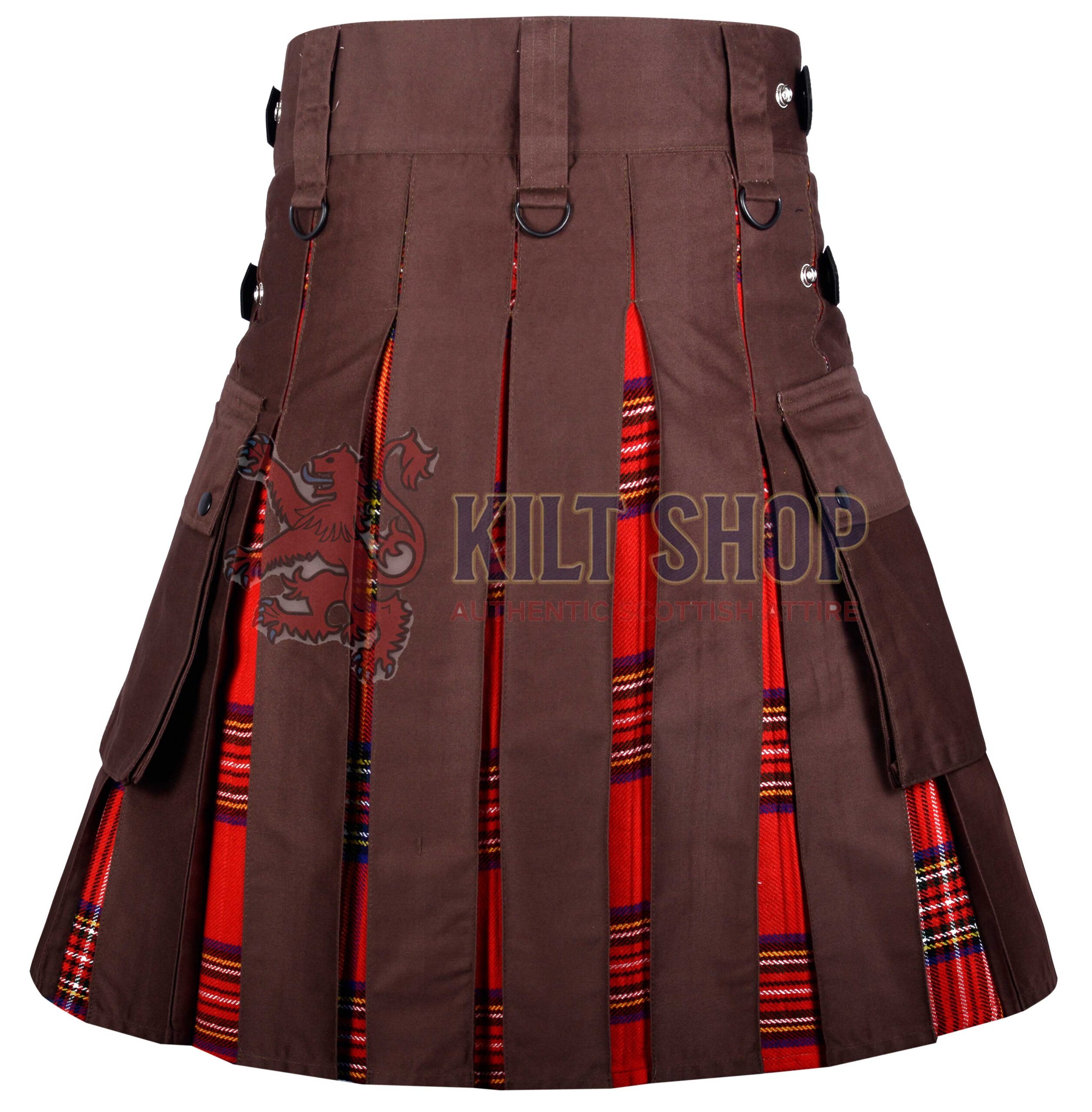 Made from premium-quality cotton fabric, the brown base provides excellent breathability, comfort, and long-lasting durability. The Royal Stewart tartan, known for its rich red and green pattern, adds a distinctive Scottish flair while harmonizing beautifully with the brown cotton body. The hybrid construction allows freedom of movement while maintaining the authentic kilt silhouette, making it suitable for casual wear, festivals, Highland games, and everyday outings.