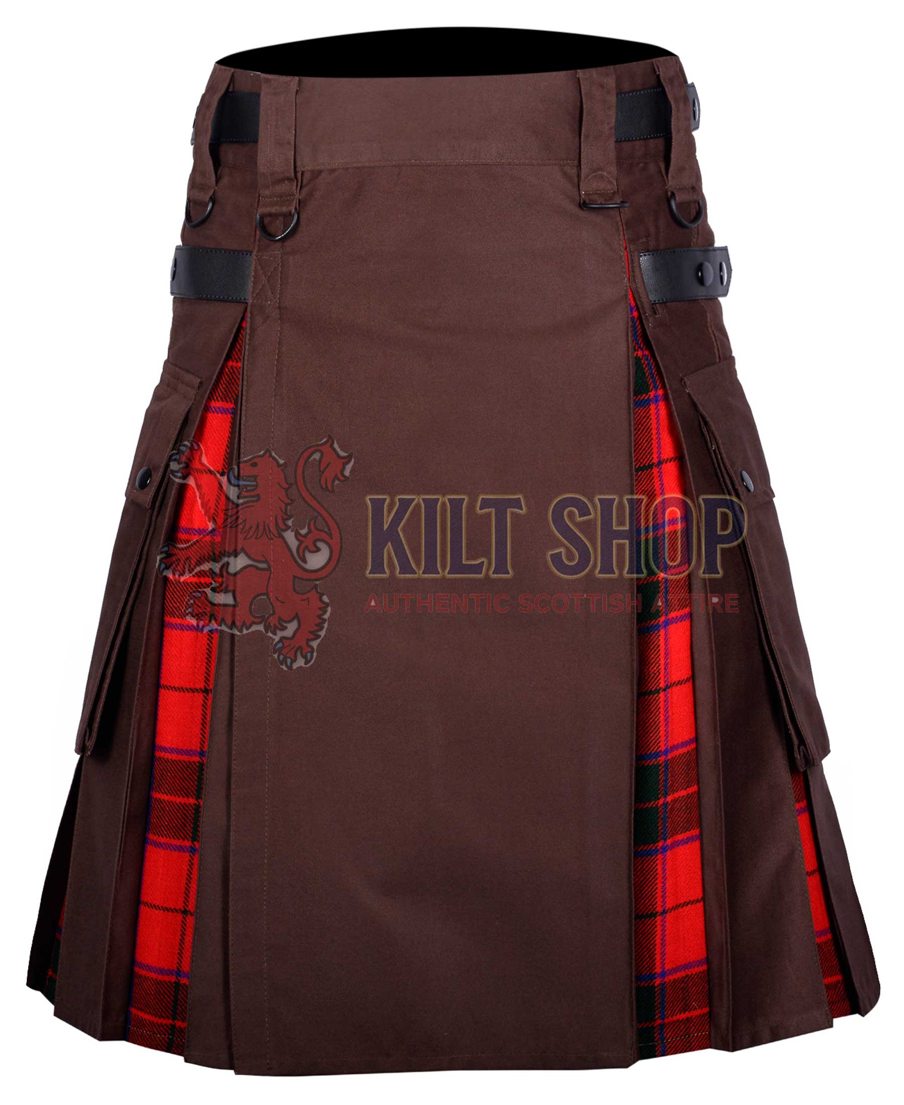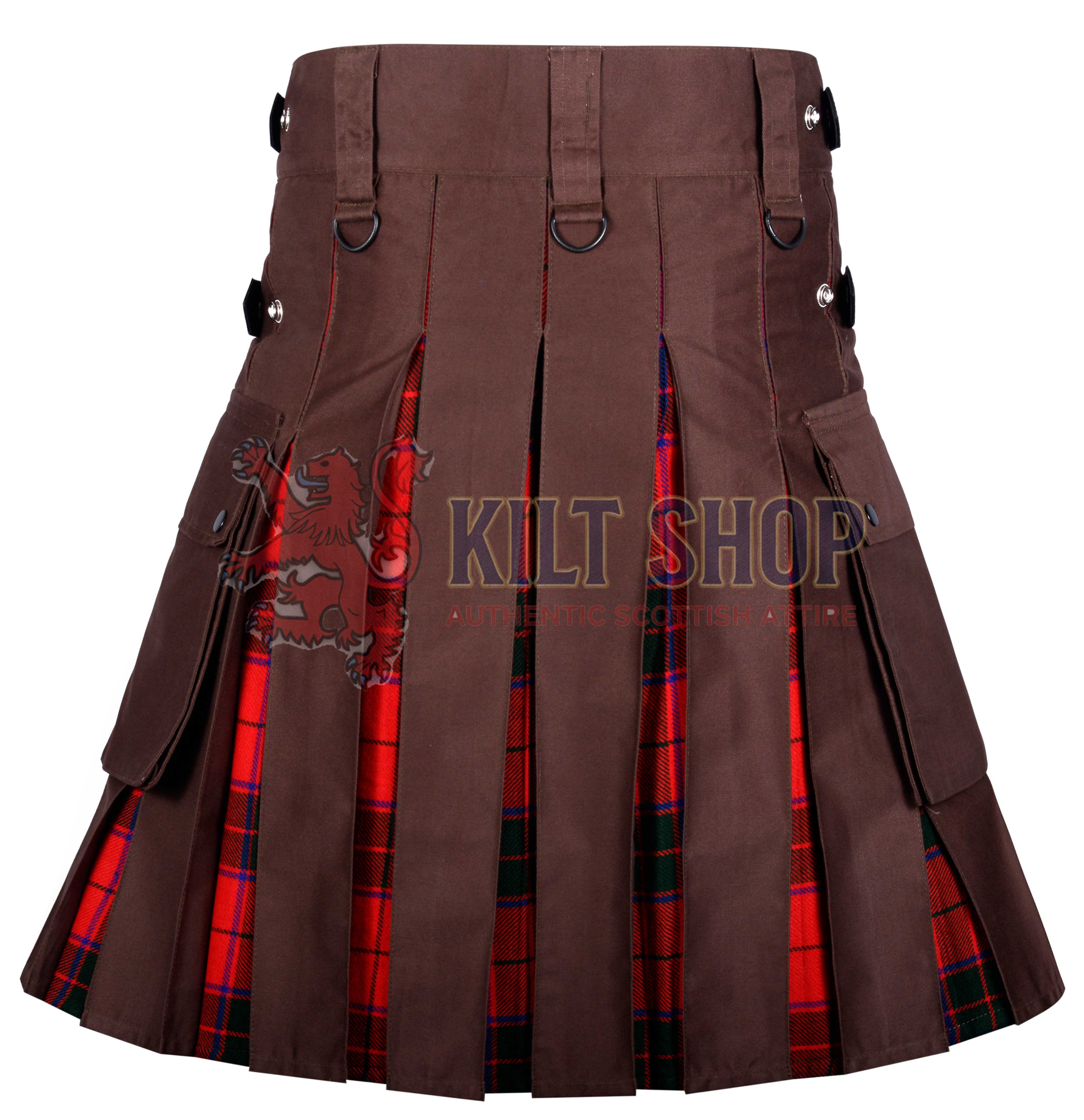 Crafted from premium-quality cotton fabric, the brown base provides excellent breathability, comfort, and durability for everyday wear. The Scottish Rose tartan, with its rich red and green pattern, adds a distinguished touch of traditional Scottish flair while blending beautifully with the brown cotton body. The hybrid construction ensures freedom of movement while maintaining the authentic kilt silhouette, making it ideal for casual outings, festivals, Highland games, and daily wear.