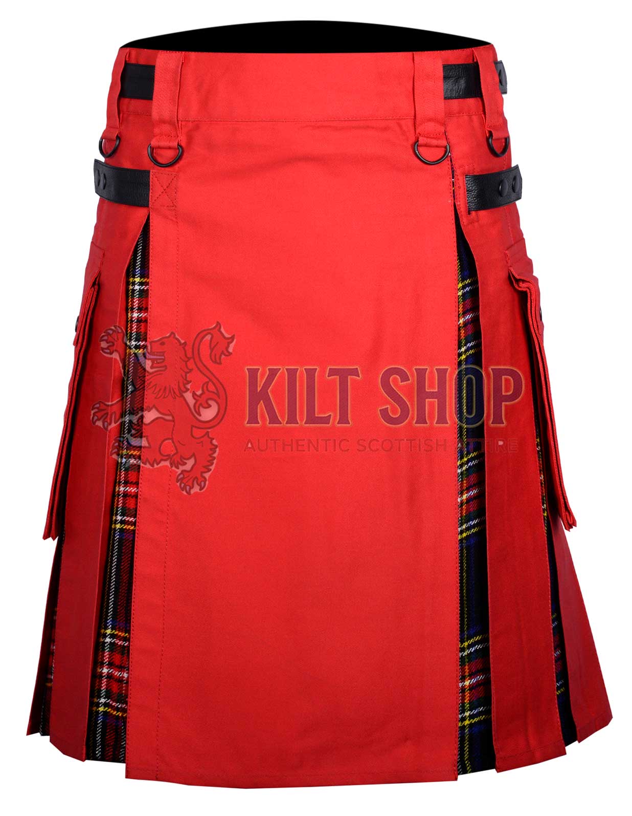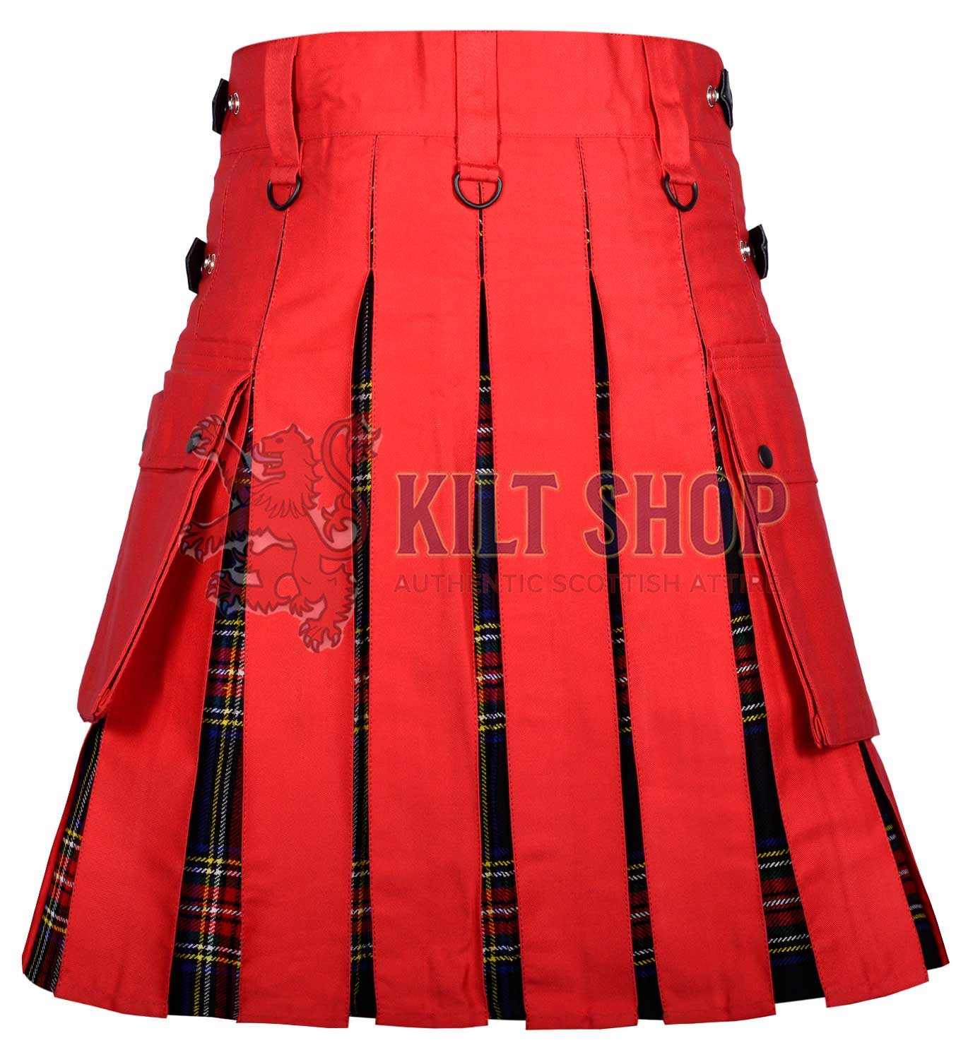 Made from premium-quality cotton fabric, this kilt is durable, breathable, and comfortable for all-day wear. The rich red base delivers a bold, eye-catching appearance, while the Black Stewart tartan panels add a classic royal contrast associated with Scottish nobility and tradition. Reinforced stitching throughout ensures long-lasting performance, even with regular and active use.